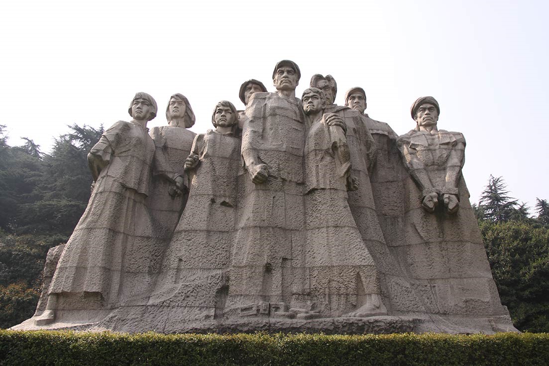 从陵园北大门步入园内,首先映入眼帘的是巨型烈士雕塑群像。群像由179块花岗石拼装而成,像高8米,宽8米,重达1400多吨。我仔细地数了一下,这组群像共塑造了9位烈士的光辉形象。雕像周围松柏常青,象征着革命烈士的忠魂永垂不朽。