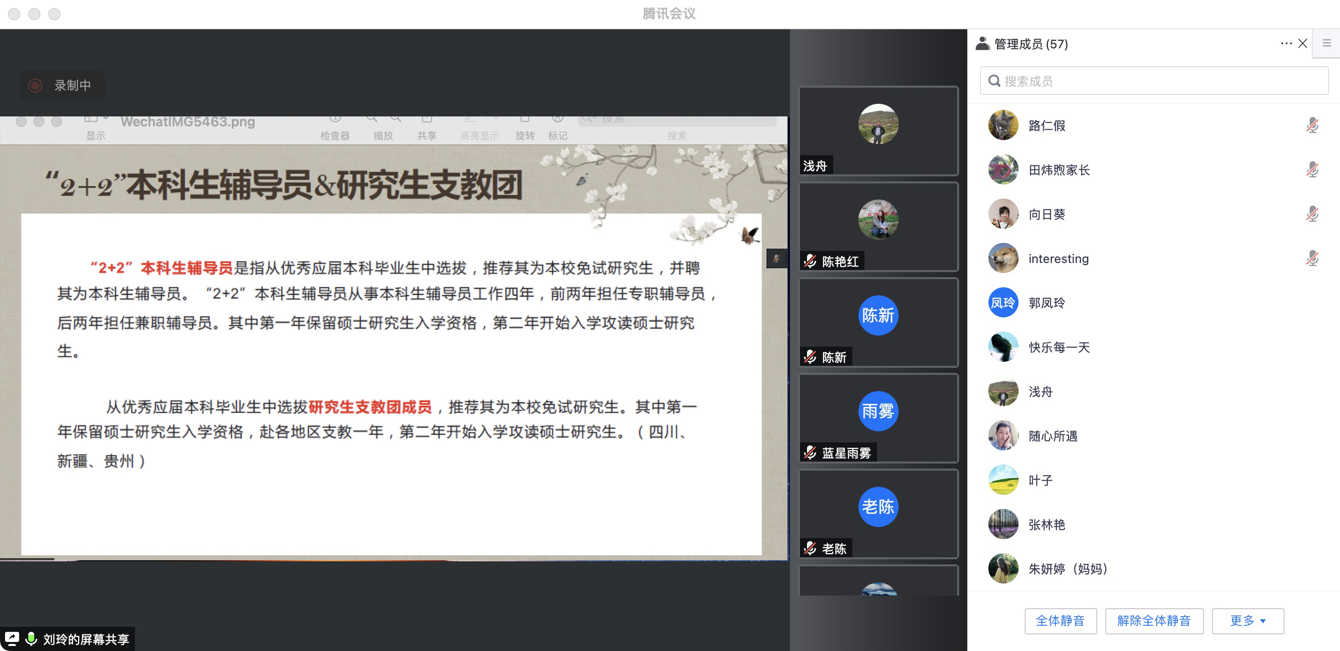 会议伊始,何蕾对本次线上会议主要内容进行了说明,并对“2+2”保研与支教团保研政策进行了总体介绍。 接着,来自外国语学院的辅导员刘玲向大家分享了她的“2+2”保研经历与体会。刘玲的分享主要从“2+2”保研政策的基本要求、自己选择“2+2”保研的原因及过程展开,并对有意愿参加“2+2”保研的同学提供了自己的建议,最后分享了自己参与“2+2”以来的收获与感想。