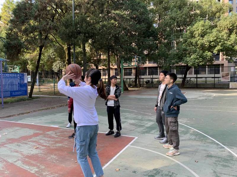 投篮时,有的同学一投便进,也有的同学屡投不中,队友们就耐心地手把手演示,鼓励他再试一次。